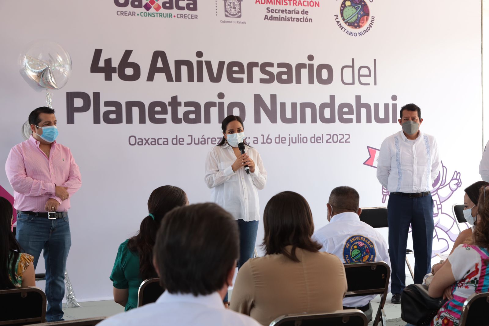 Oaxaca de Juárez, Oax. 16 de julio de 2022.- Después de una semana de festejos por el 46 aniversario del Planetario Nundehui, la celebración concluyó este sábado con la entrega de reconocimientos al personal de este espacio, por parte de la titular de la Secretaría de Administración, Mariana Nassar Piñeyro.