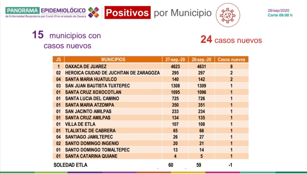 Respecto a los municipios con diagnostico nuevos, Oaxaca de Juárez encabeza la lista con ocho casos, seguido de la Heroica Ciudad de Juchitán de Zaragoza y Santa María Huatulco con dos reportes cada uno, y el resto un caso.