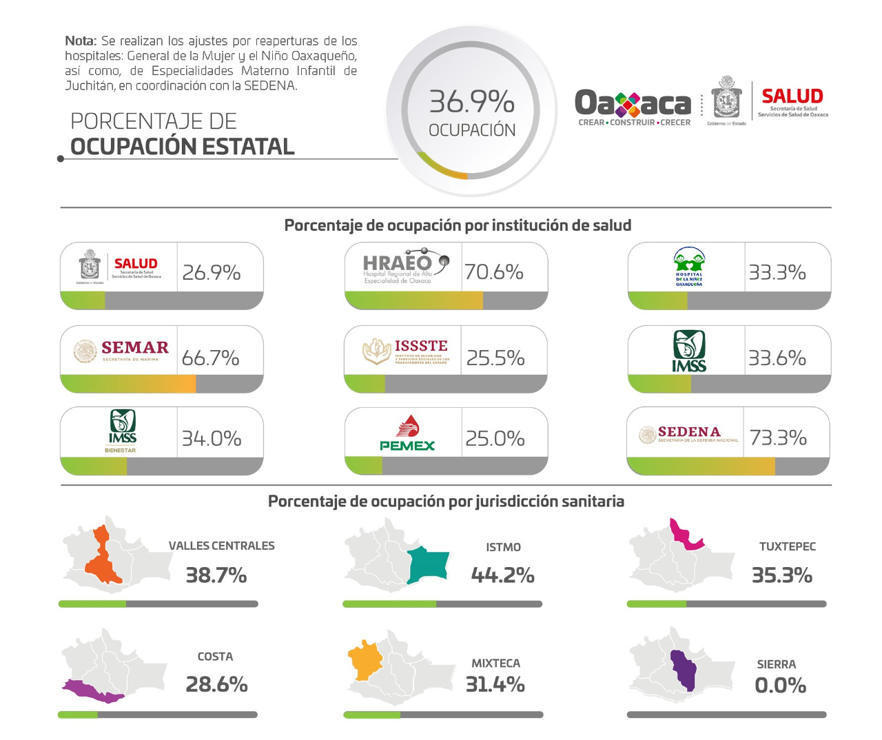 De manera general, la red hospitalaria presenta 36.9% de saturación médica, con un aumento del 2.2% en las últimas 24 horas, con mayor ocupación en el Istmo tras reportar 44.2%, seguido de Valles Centrales con 38.7%, Tuxtepec con 35.3%, Mixteca con 31.4%, Costa con 28.6% y la Sierra se mantiene en 0%.
