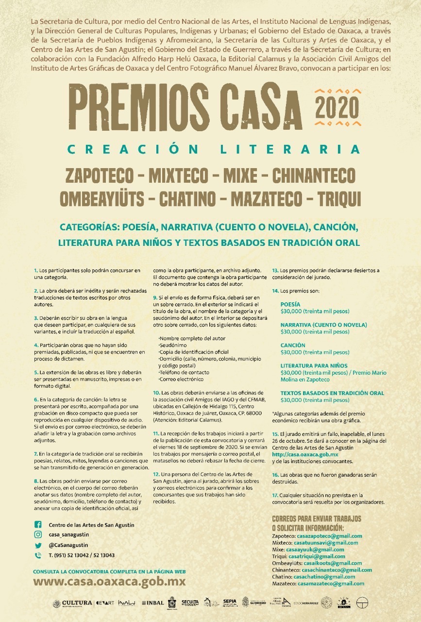 Oaxaca de Juárez, Oax. 25 de abril de 2020.- El Centro de Artes de San Agustín (CaSa) convoca a participar en los “Premios CaSa 2020” de creación literaria en mazateco, chatino, chinanteco, ombeayiüts, triqui, mixe, mixteco, zapoteco; y en el Premio FAHHO-CaSa Emiliano Cruz Santiago, que busca reconocer y apoyar a personas que promueven sus lenguas de manera individual o colectiva bajo su propia iniciativa.