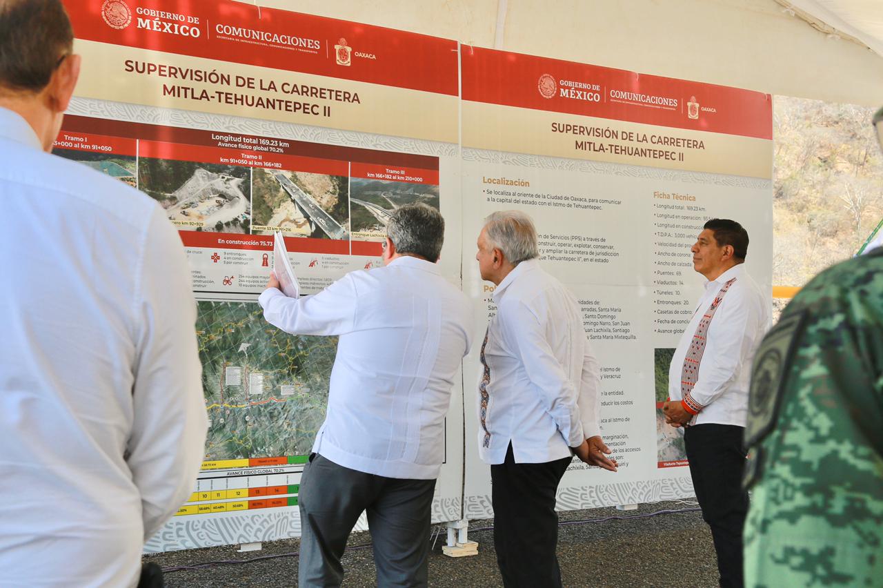 Durante la supervisión realizada en el punto Lachixila entronque Tehuantepec II Km. 169+232 de esta vía en construcción, el Presidente de la República destacó el trabajo coordinado que se ha llevado a cabo para avanzar en los trabajos de esta importe vía de comunicación y refrendó su compromiso para concluirla.