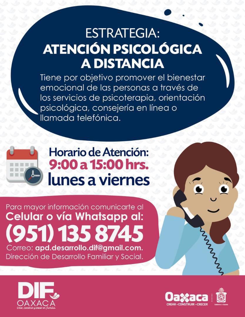 Por otra parte, personal del Sistema DIF Oaxaca, continúa brindando los servicios de psicoterapia, orientación psicológica y consejería en línea, con el objetivo de promover el bienestar emocional de las personas, brindando atención personalizada de lunes a viernes de 9:00 a 15:00 horas, a través de la línea telefónica 951-135-87-45 o por whats app, así como en el correo institucional ddfs@midifoaxaca.Info