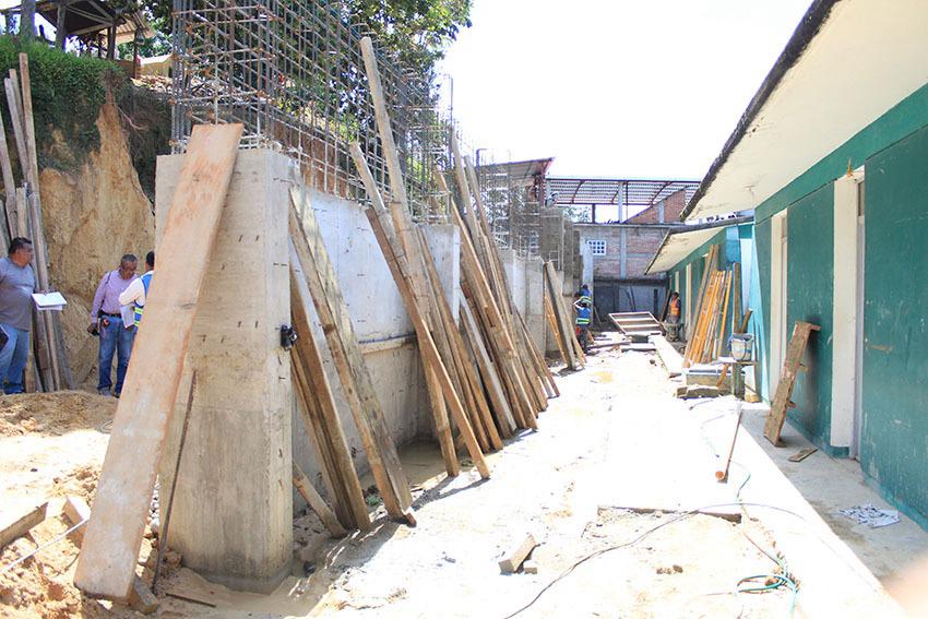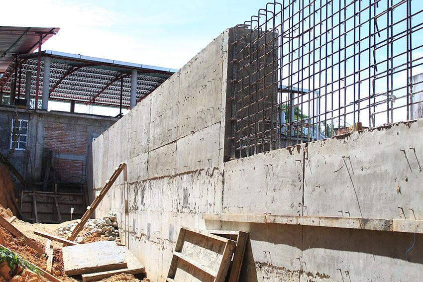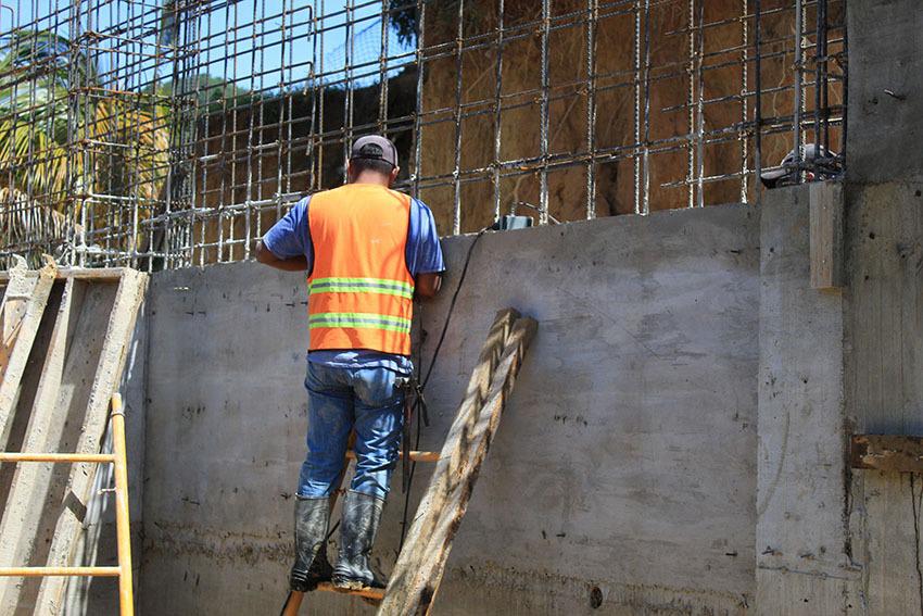 El titular de la dependencia, Carlos Vichido Hernández destacó que se edifican 47.85 metros lineales de muro de concreto por 5.70 de altura, para lo cual se han realizado trabajos de trazo, nivelación, excavación con maquinaria pesada, cimentación con base de zapata de concreto armado y peralte; se elabora con concreto armado, cadenas y castillos intermedios.