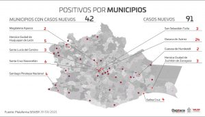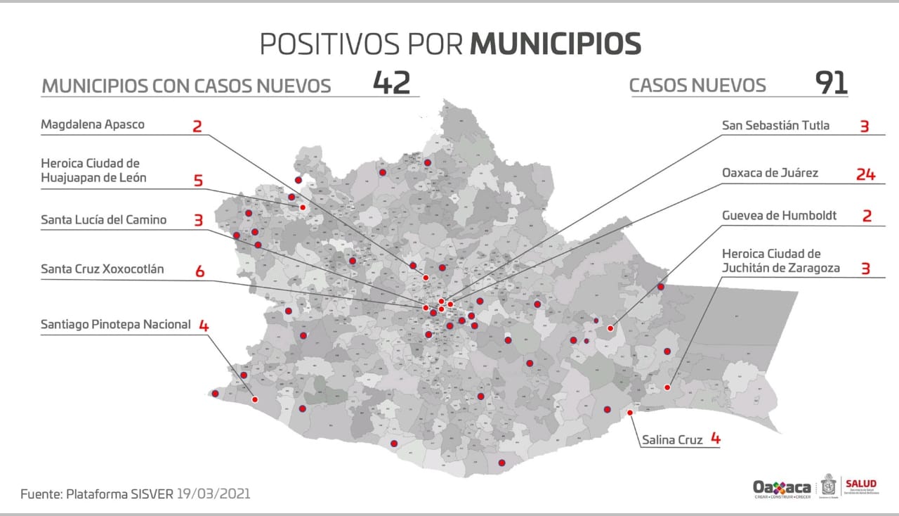 En este sentido, detalló que en las últimas 24 horas se detectaron 42 ayuntamientos con contagios nuevos, principalmente: Oaxaca de Juárez con 24, para un total de 12 mil 358 acumulados; Santa Cruz Xoxocotlán con seis, para un acumulado de dos mil 603; Heroica Ciudad de Huajuapan de León con cinco, con lo que llega a mil 709 acumulados; Salina Cruz y Santiago Pinotepa Nacional con cuatro, cada uno, para un global de mil 098 y 310, respectivamente, el resto tres, dos y un caso.