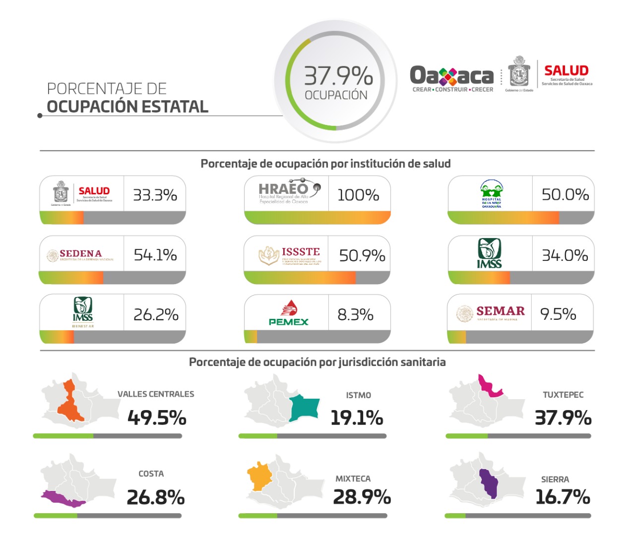 Finalmente, Tapia Peláez agregó que existen seis centros de valoración de primer contacto en la zona conurbada: el Hospital General de zona número 1 del Instituto Mexicano del Seguro Social (IMSS), el Hospital Presidente Juárez del Instituto de Seguridad y Servicios Sociales de los Trabajadores del Estado (ISSSTE), el Hospital General “Doctor Aurelio Valdivieso”, el Centro de Salud urbano uno, Hospital Móvil y el Hospital Regional de Alta Especialidad de Oaxaca (HRAEO).