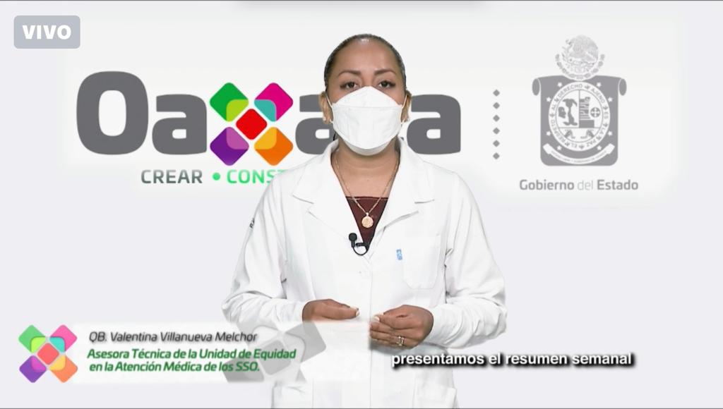Oaxaca de Juárez, Oax. 21 de agosto de 2022.- Al presentar el resumen semanal de la situación epidemiológica de la pandemia por COVID-19 en la entidad, la asesora Técnica de la Unidad de Equidad en la Atención Médica de los Servicios de Salud de Oaxaca (SSO), Valentina Villanueva Melchor, precisó que durante el período comprendido del 14 al 20 de agosto, se registró un acumulado 146 mil 211 casos confirmados del virus SARS-CoV-2.