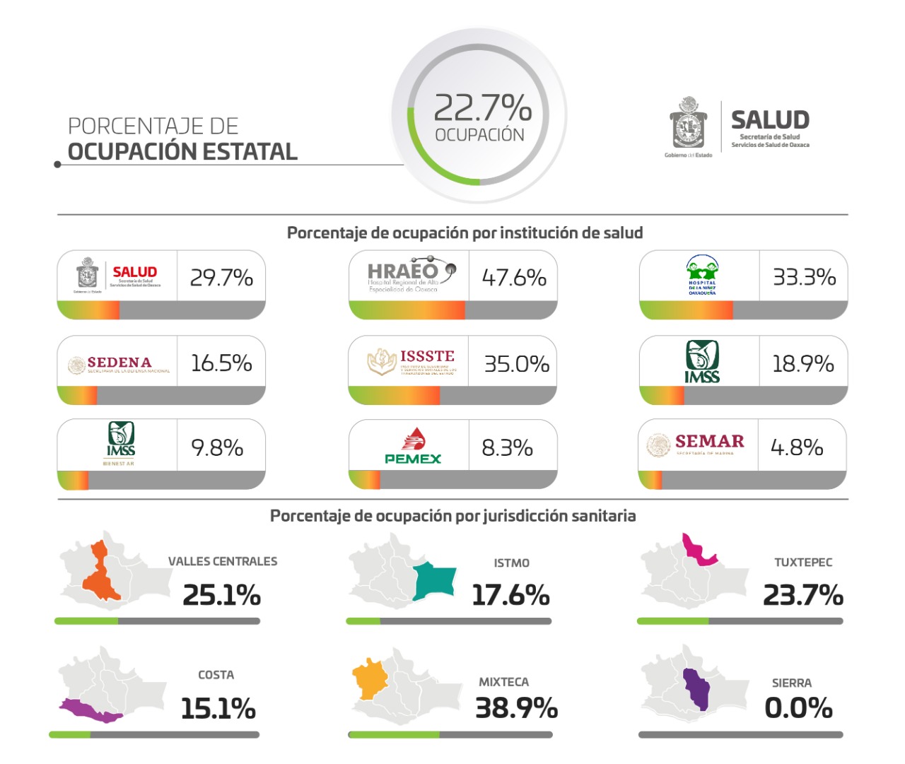 Por Jurisdicciones Sanitarias, Valles Centrales cuenta con 78 camas ocupadas con un 25.1%, Istmo 21 camas ocupadas con 17.6%, Tuxtepec 14 camas ocupadas con 23.7%, Costa ocho camas ocupadas con un 15.1% y Mixteca 14 camas ocupadas con 38.9% y la Sierra 0%.