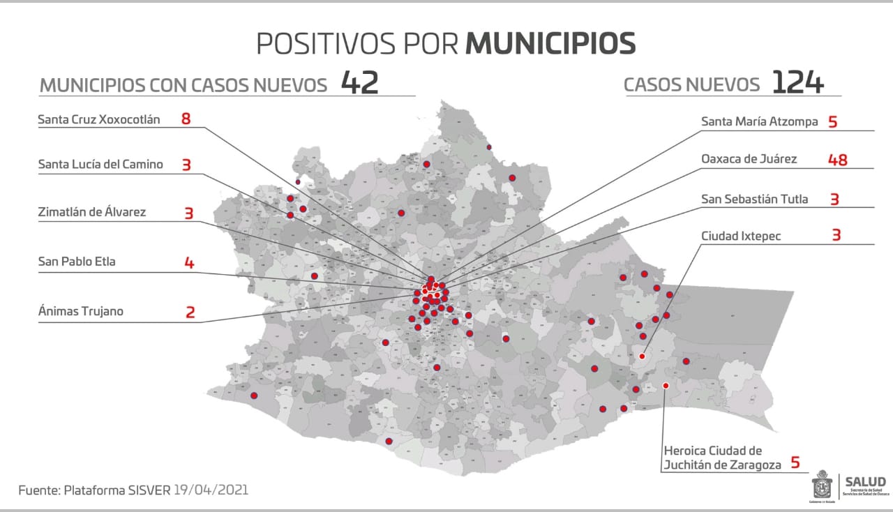 Señaló que los 124 casos nuevos de los días 17, 18 y 19 de abril, se ubican en 42 municipios, siendo los que mayor número de casos presentan: Oaxaca de Juárez con 48, Santa Cruz Xoxocotlán ocho, Santa María Atzompa y Juchitán de Zaragoza cinco cada uno, San Pablo Etla cuatro, el resto tres, dos y un caso.