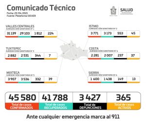 Oaxaca de Juárez, Oax. 23 de abril de 2021.- Los Servicios de Salud de Oaxaca (SSO), reportan al corte de este viernes 23 de abril, 47 casos nuevos de COVID-19 y nueve defunciones, sumando 45 mil 580 casos acumulados y tres mil 427 muertes derivadas del coronavirus.