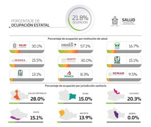 Zacarías Jiménez dijo que, en relación a la ocupación hospitalaria, hay 130 camas ocupadas de un total de 597 y disponibles 467 camas, lo que representa un 21.8% de ocupación global; hay 16 nuevos hospitalizados y cuatro hospitales se encuentran al 100%.