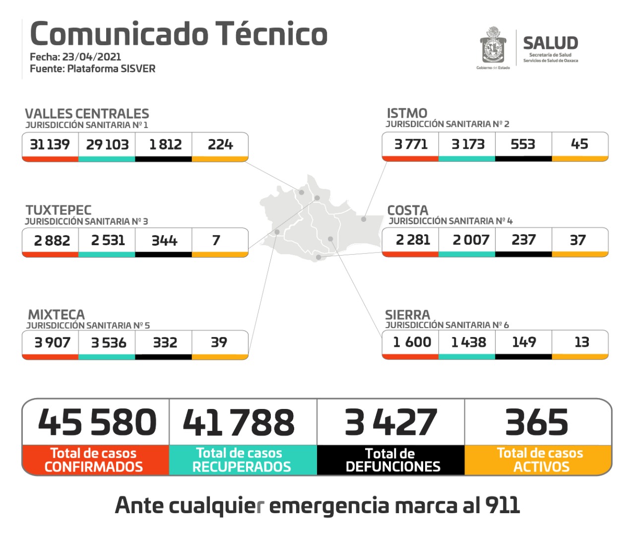 Oaxaca de Juárez, Oax. 23 de abril de 2021.- Los Servicios de Salud de Oaxaca (SSO), reportan al corte de este viernes 23 de abril, 47 casos nuevos de COVID-19 y nueve defunciones, sumando 45 mil 580 casos acumulados y tres mil 427 muertes derivadas del coronavirus.