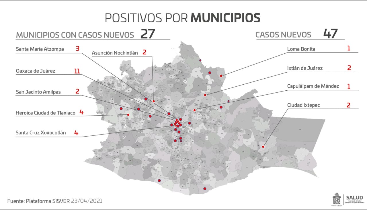 Los 47 casos nuevos se distribuyen en 27 municipios, siendo el de Oaxaca de Juárez con 11 casos, Santa Cruz Xoxocotlán y Tlaxiaco cuatro cada uno, Santa María Atzompa tres; el resto dos y un caso.