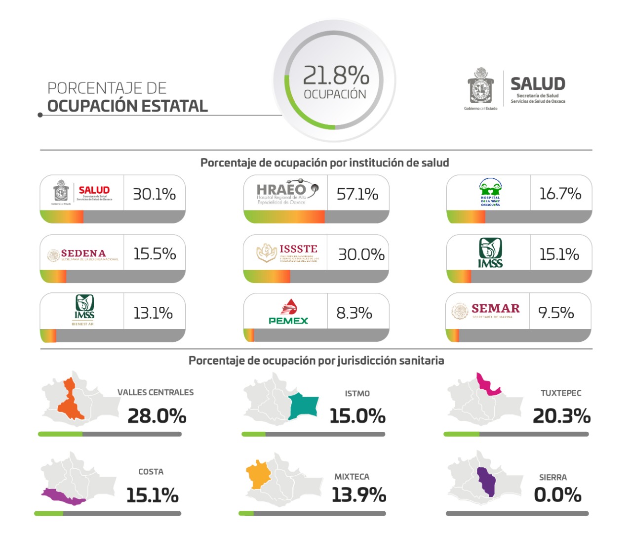 Recordó que hay seis centros de valoración de primer contacto en la zona conurbada como el hospital general de zona 1 del Instituto Mexicano del Seguro Social (IMSS), el hospital regional Presidente Juárez del Instituto de Seguridad y Servicios Sociales de los Trabajadores del Estado (ISSSTE), el Hospital General Doctor Aurelio Valdivieso, Centro de Salud Urbano 1, Hospital móvil y el Hospital Regional de Alta Especialidad de Oaxaca.