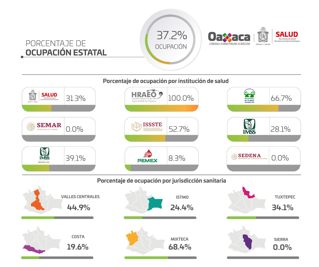 En relación a la ocupación hospitalaria, la red médica global se encuentra en 37.2%, la Jurisdicción Sanitaria de la Mixteca presenta el 68.4% de saturación, seguido de Valles Centrales con 44.9%, y Tuxtepec con 34.1%.