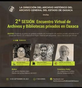 La Segunda Sesión del “Encuentro virtual de Archivos y Bibliotecas privados en Oaxaca” estará disponible el próximo 14 de septiembre a las 17:00 horas y el público podrá verlo en una transmisión en vivo a través de la plataforma Facebook Live. Para acceder, sólo es necesario acceder al sitio oficial @ArchivoGeneralDelEstadoDeOaxaca de esta red social.