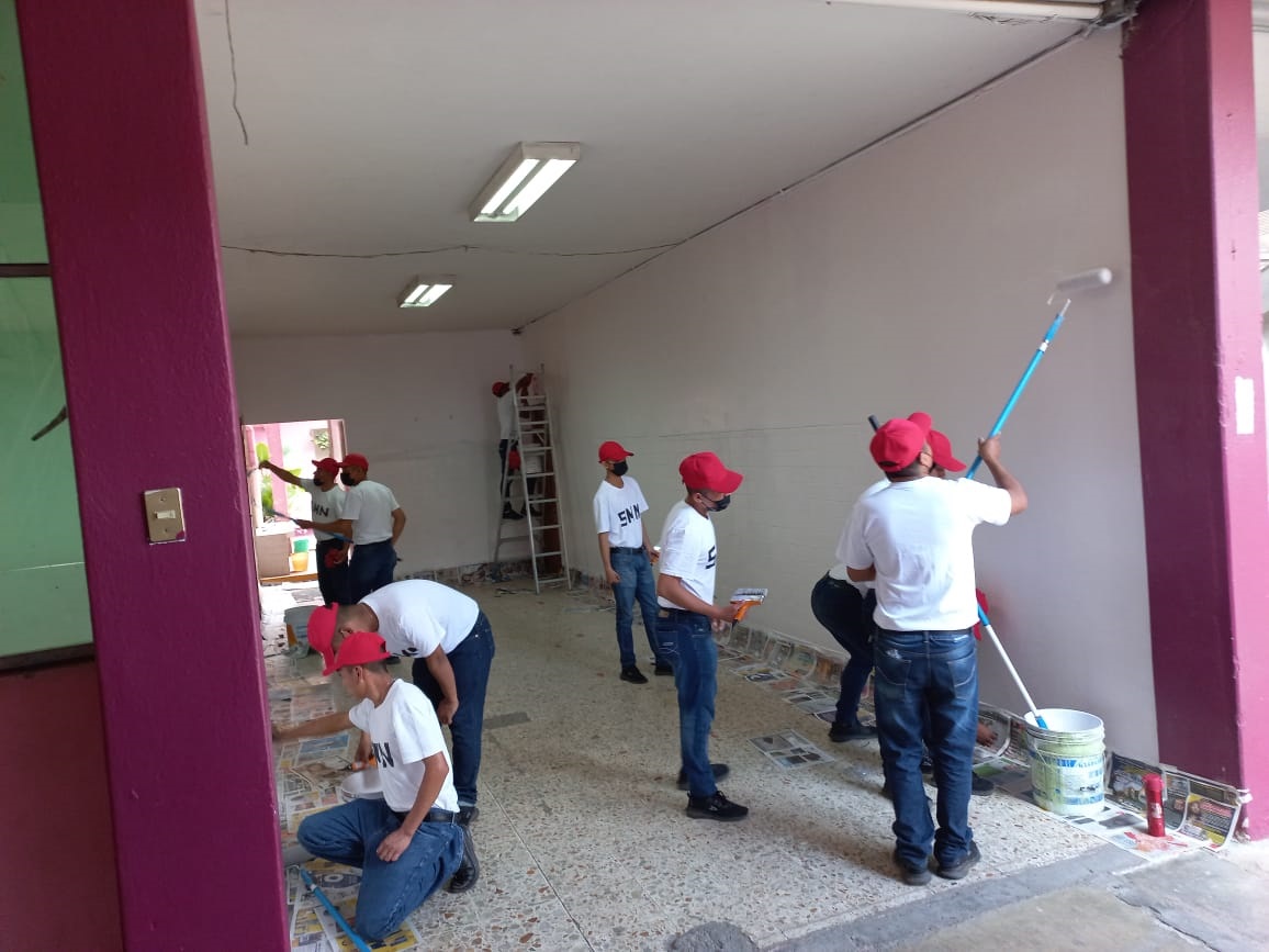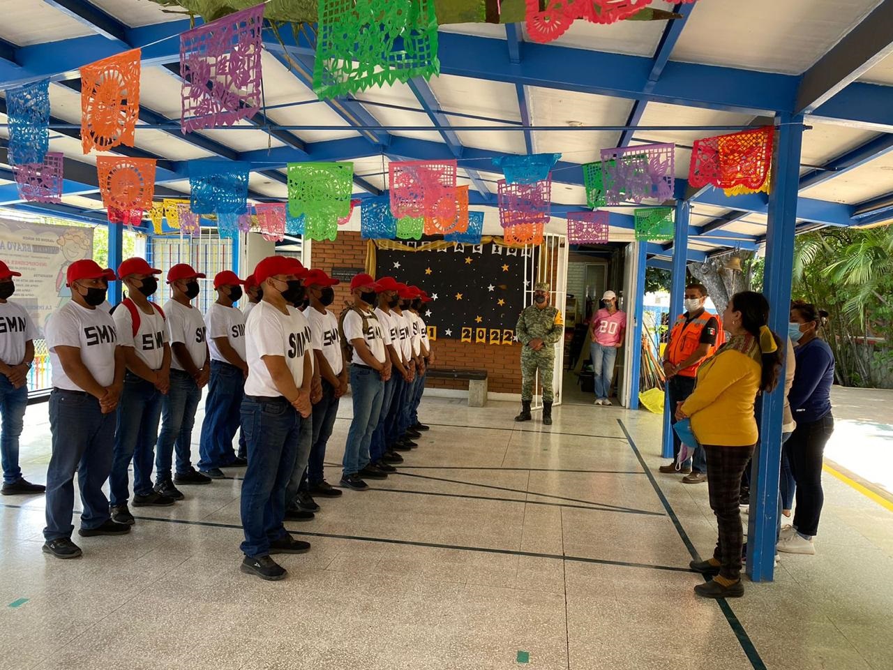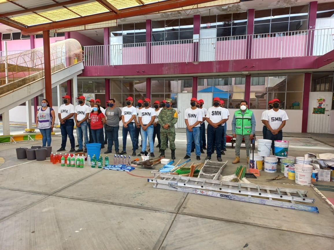 Los conscriptos, en conjunto con el área de Protección Civil y Emergencia Escolar del Instituto, personal educativo, madres y padres de familia, realizan en las instalaciones escolares tareas como la limpieza en general, incluidos techumbres y tinacos, pintura exterior e interior, instalación de señalética y poda de árboles, entre otros.