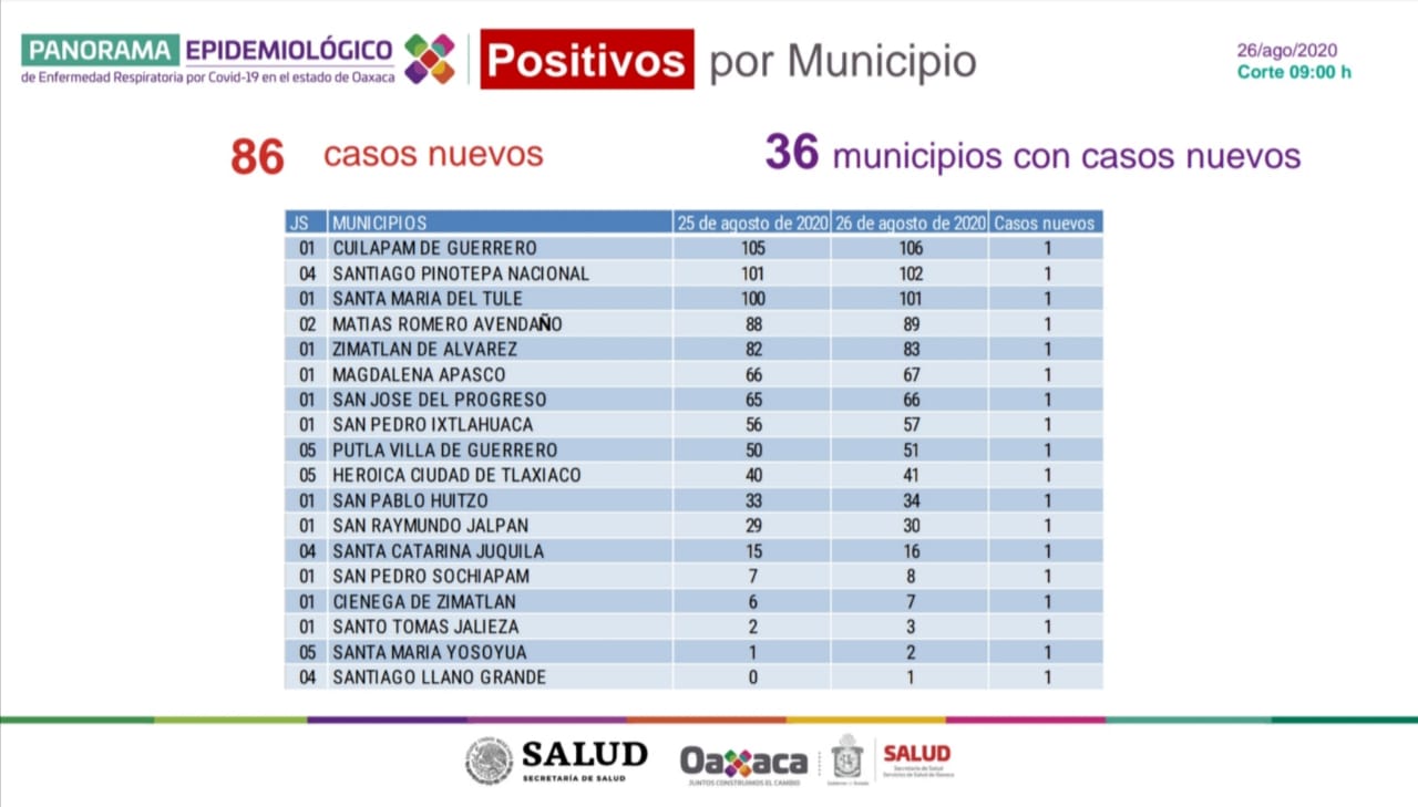 Refirió que los 86 casos nuevos registrados hoy se ubican en 36 municipios, siendo los de mayor prevalencia Oaxaca de Juárez con 27, Santa Cruz Xoxocotlán ocho, Santa Lucía del Camino siete, Huajuapan de León y San Sebastián Tutla tres cada uno, el resto dos y uno.