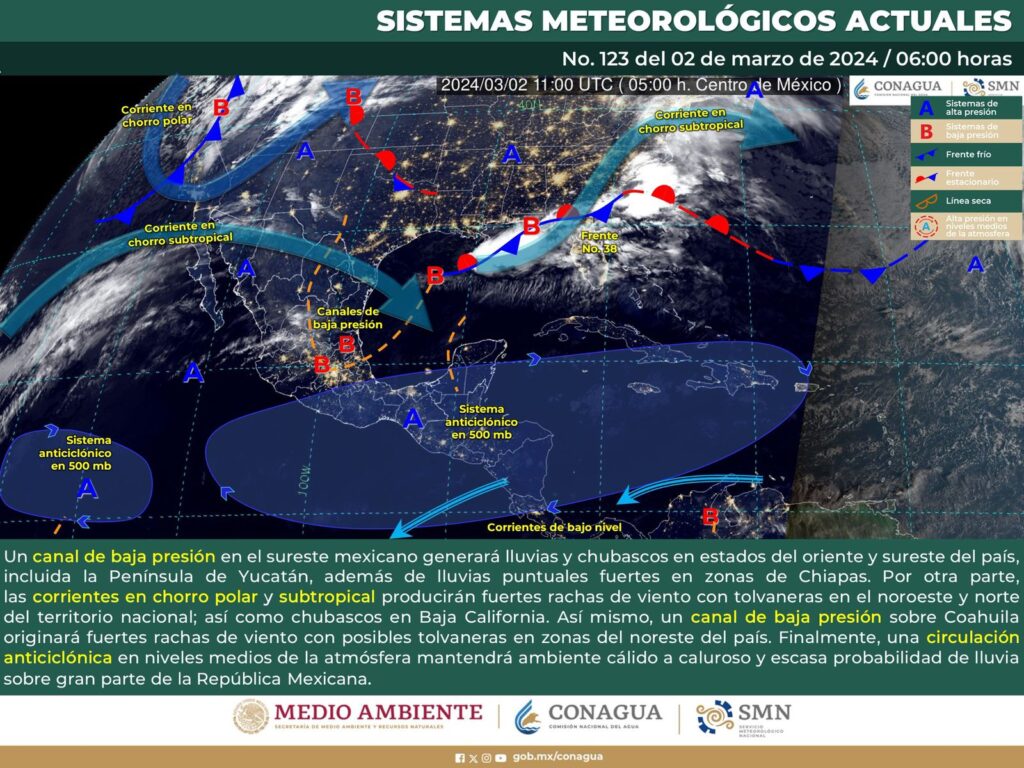 Oaxaca de Juárez, Oax. 2 de marzo de 2024.- La Coordinación Estatal de Protección Civil y Gestión de Riesgos (CEPCyGR) informa que un sistema anticiclónico en niveles medios, mantiene tiempo estable, cielo despejado, sol abundante e intensa radiación solar con muy baja probabilidad de lluvias y vientos del norte en el estado.
