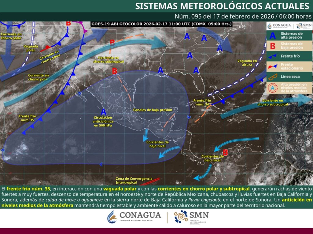 Además, un nuevo frente frío se localiza sobre el noroeste y norte del país, por lo que se mantiene en vigilancia su evolución y posibles efectos indirectos.