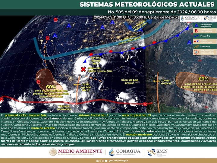 De acuerdo con el pronóstico del tiempo emitido por la Comisión Nacional del Agua (Conagua), el potencial ciclón tropical seis seguirá trasladándose paralelo al Golfo de México, interactuado con la onda tropical número 21, el frente frío número 1 y una baja presión en el Pacífico, generando condiciones lluviosas para Oaxaca.