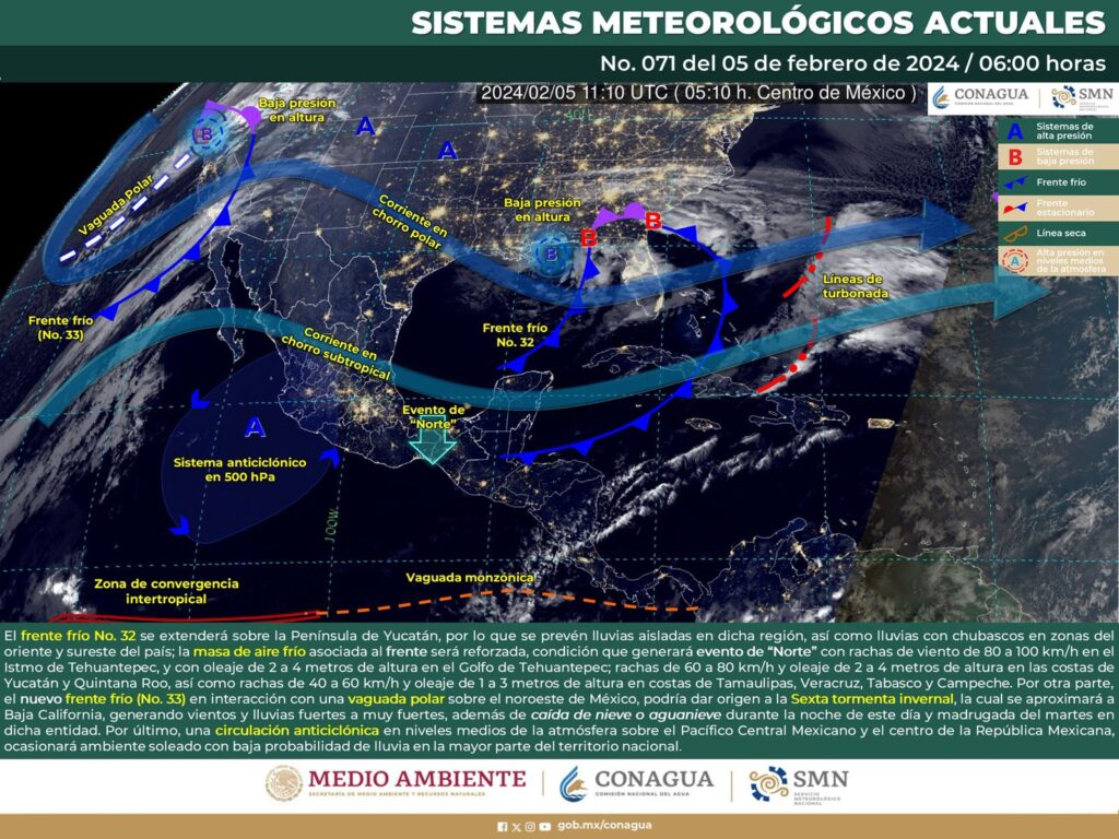Oaxaca de Juárez, Oax. 5 de febrero de 2024.- La Coordinación Estatal de Protección Civil y Gestión de Riesgos (CEPCyGR) informa que el frente frío número 32 se extenderá sobre la Península de Yucatán y estará generando efectos directos al estado oaxaqueño.