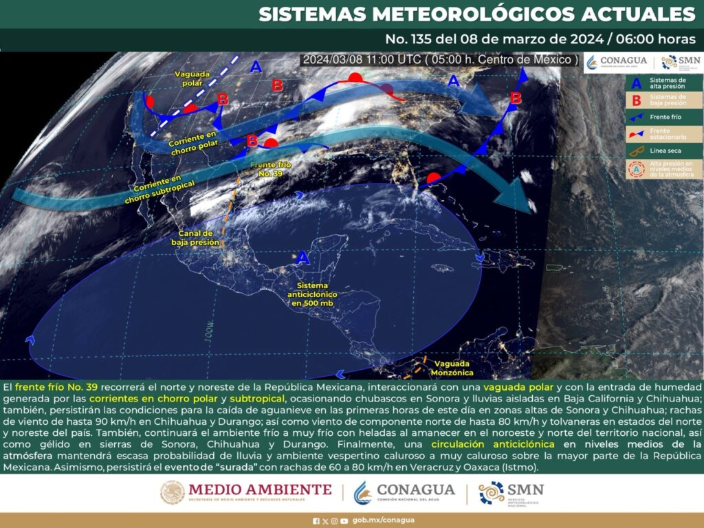 De acuerdo con el pronóstico emitido por la Comisión Nacional del Agua (Conagua),se mantendrá un patrón de abundante sol, intensa radiación solar, baja probabilidad de lluvias, ambiente caluroso a muy caluroso y periodos de bochorno en zonas costeras.