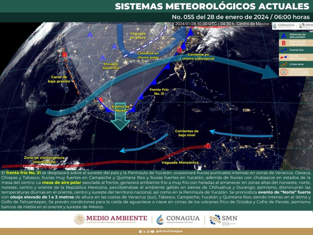 Oaxaca de Juárez, Oax. 28 de enero de 2024.- La Coordinación Estatal de Protección Civil y Gestión de Riesgos (CEPCyGR) informa que, de acuerdo con el pronóstico emitido por la Comisión Nacional del Agua (Conagua), el frente frío número 31 se extiende desde el sur del Golfo de México hasta la Península de la Florida; seguirá desarrollando lluvias de intensidad variable en la mitad norte del estado de Oaxaca.