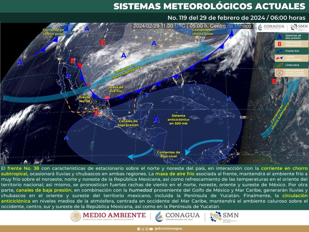 Por el momento, el sistema anticiclónico mantendrá un patrón de dominio, bloqueando al frente frío número 38 por lo que se mantendrá estacionado sobre el norte de la República Mexicana.