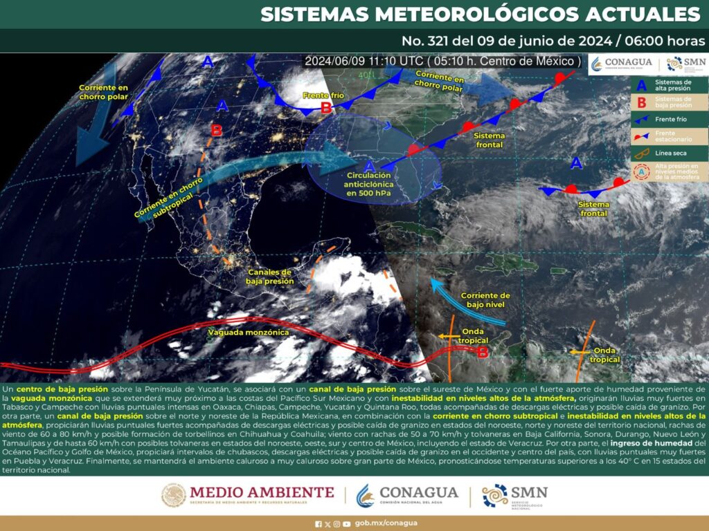 Lo anterior, de acuerdo con el pronóstico del tiempo emitido por la Comisión Nacional del Agua (Conagua) que señala que un canal de baja presión sobre el sureste de país en combinación con la vaguada monzónica (una región con presencia de lluvias o ciclones que se forma en las áreas tropicales y subtropicales) extendida muy próxima al pacífico sur, influyendo con pulsaciones de humedad hacia el interior del estado.