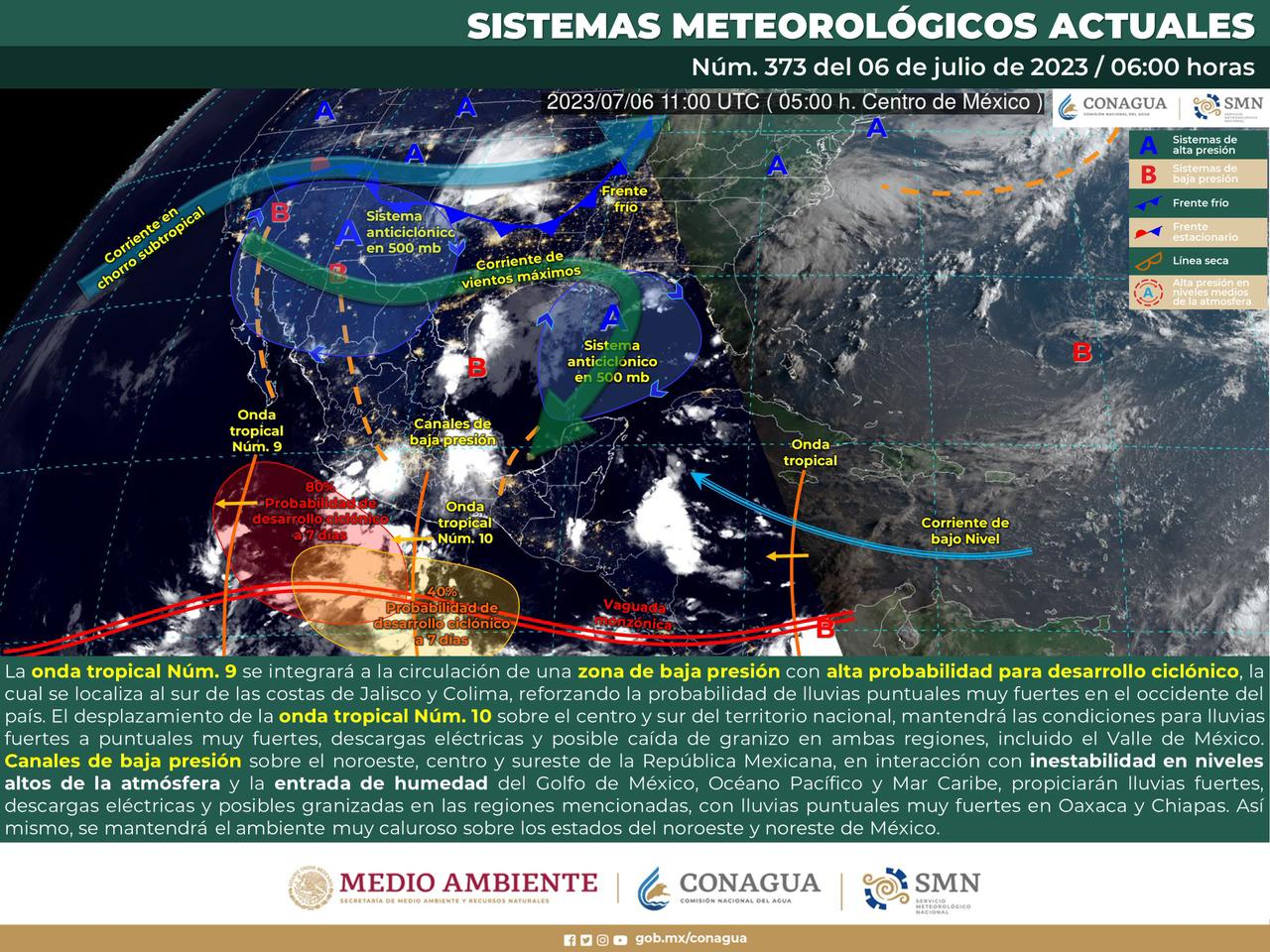 Oaxaca de Juárez, Oax. 6 de julio de 2023.- La Coordinación Estatal de Protección Civil y Gestión de Riesgos (CEPCyGR) informa que de acuerdo con la Comisión Nacional del Agua (Conagua) para este jueves se prevén lluvias de intensidad variable acompañadas de actividad eléctrica y posible caída de granizo en distintas regiones del estado.