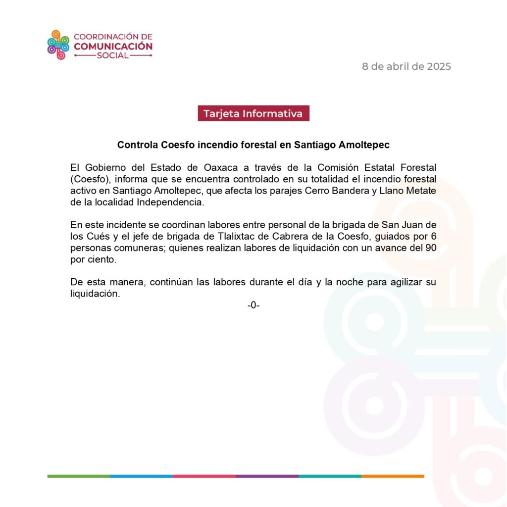 El Gobierno del Estado de Oaxaca a través de la Comisión Estatal Forestal (Coesfo), informa que se encuentra controlado en su totalidad el incendio forestal activo en Santiago Amoltepec, que afecta los parajes Cerro Bandera y Llano Metate de la localidad Independencia.