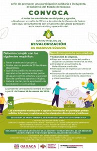 Oaxaca de Juárez, Oax., 17 de enero de 2023.- A fin de encontrar una solución solidaria e incluyente al problema de la basura, el Gobierno del Estado de Oaxaca convoca a las autoridades municipales y agrarias para que de manera conjunta participen en la construcción y operación de un Centro Integral de Revalorización de Residuos Sólidos.