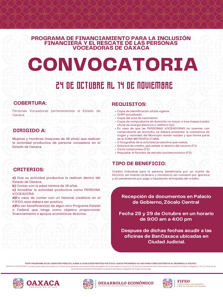 Oaxaca de Juárez, Oax. 24 de octubre de 2025.- El Gobierno del Estado convoca a participar en el Programa para la Inclusión Financiera y el Rescate de las Personas Voceadoras de Oaxaca, en respaldo a quienes desempeñan esta función y en un acto de justicia social.
