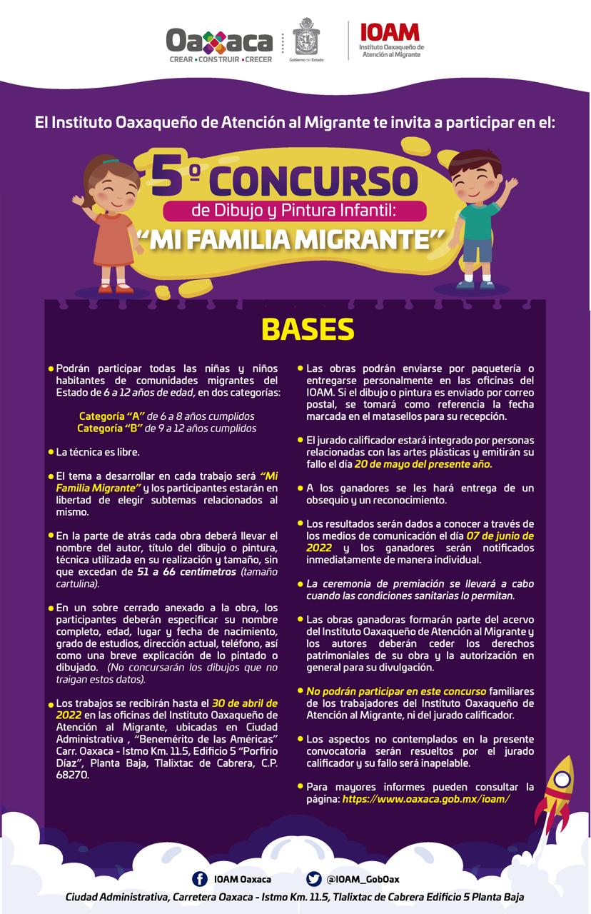 Tlalixtac de Cabrera, Oax. 10 de enero de 2022.- El Gobierno del Estado a través del Instituto Oaxaqueño de Atención al Migrante (IOAM), dio a conocer la convocatoria sobre el Quinto Concurso de Dibujo y Pintura Infantil: Mi Familia Migrante.