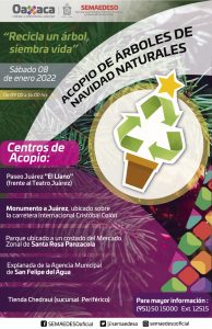 Oaxaca de Juárez, Oax. 04 de enero de 2022.- La Secretaría del Medio Ambiente, Energías y Desarrollo Sustentable (Semaedeso) en coordinación con la Comisión Estatal Forestal (Coesfo) realizará la campaña de acopio de árboles navideños naturales.