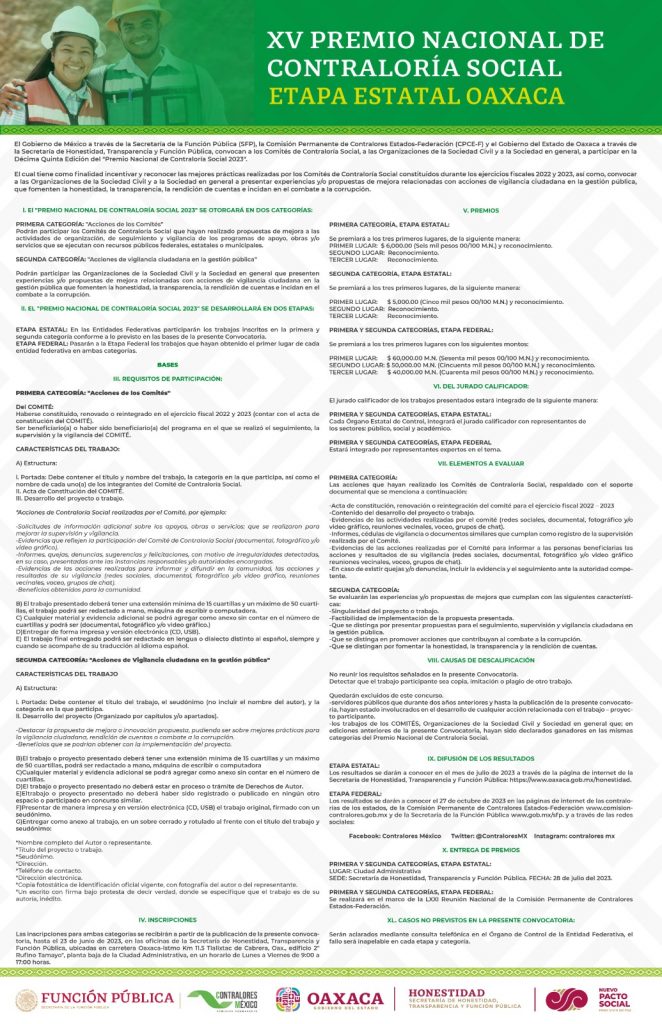 Tlalixtac de Cabrera, Oax. 4 de junio de 2023. La Comisión Permanente de Contralores Estados-Federación a través de la Secretaría de Honestidad, Transparencia y Función Pública invita a los Comités de Contraloría Social, Organizaciones de la Sociedad Civil y la sociedad en general a participar en la XV edición del Premio Nacional de Contraloría Social 2023, etapa estatal.