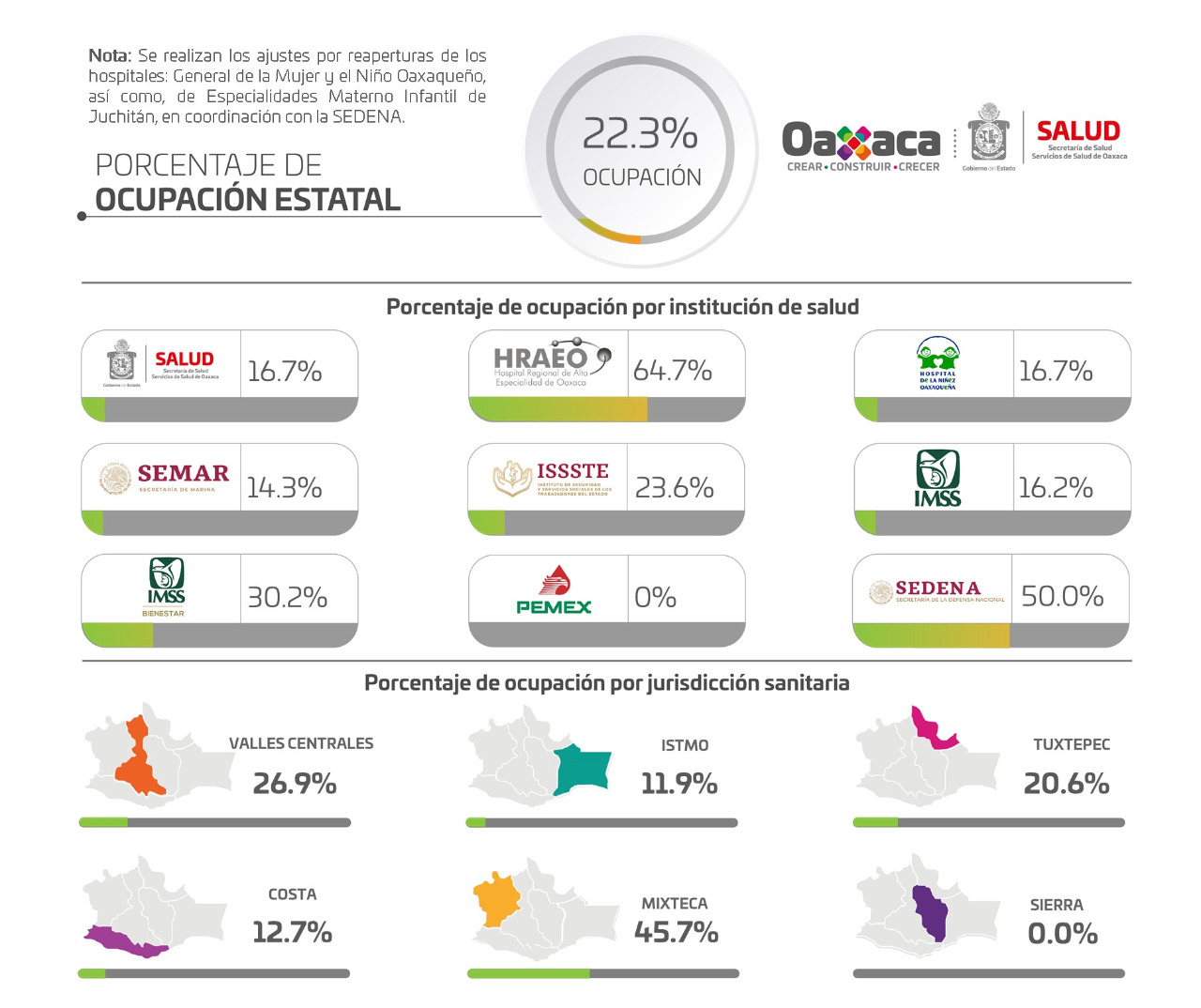 La red hospitalaria global es de 22.3% de ocupación, con mayor número de pacientes en la Mixteca al reportar 45.7% de saturación, seguido de Valles Centrales con 26.9%, Tuxtepec con 20.6%, Istmo con 11.9%, Costa 12.7%, y Sierra 0%.