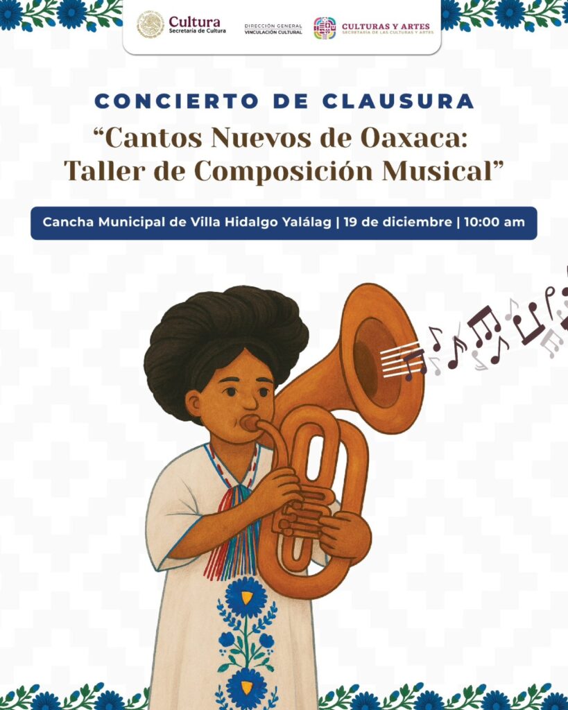 A las 10:00 horas en la cancha municipal de Villa Hidalgo Yalálag, se efectuará el concierto de clausura del taller Cantos Nuevos de Oaxaca, un proyecto de composición musical desarrollado en colaboración con la Secretaría de Cultura de México. En este encuentro, el público podrá escuchar obras originales creadas por compositoras y compositores oaxaqueños.