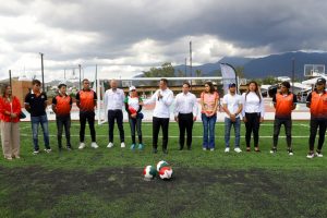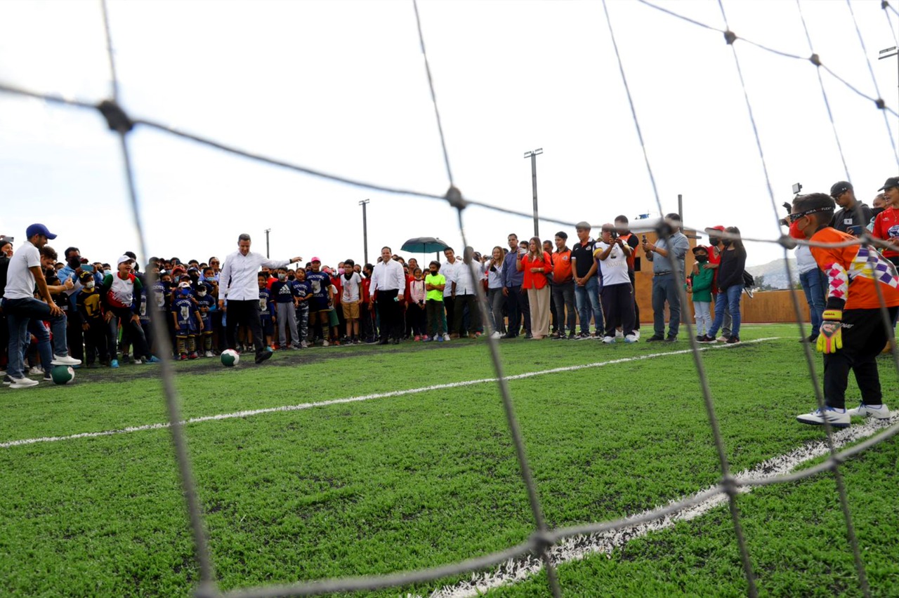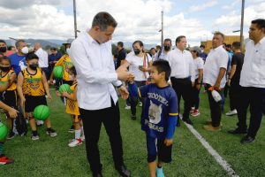 “Este es un espacio muy bonito que queremos entregarles a ustedes, que queremos que lo protejan también con el presidente Municipal y que lo sigan haciendo más grande; y se hace grande cuando vemos a las niñas y niños de Oaxaca poderse desenvolverse y disfrutar de un espacio digno para hacer deporte”, enfatizó el Gobernador al tiempo de señalar a la población infantil asistente que la constancia y perseverancia en el deporte pueden llevarlos a ser parte de un equipo profesional de fútbol como los “Alebrijes”.