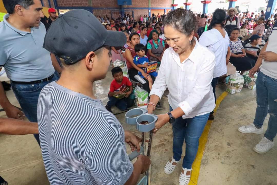 Después de emitir su mensaje, la Presidenta Honoraria del DIF Oaxaca entregó de manera personal a las familias las dotaciones alimentarias como parte del Programa Emergente por Temporada Invernal, así como los juguetes y aparatos funcionales que consistieron en muletas canadienses, bastones curvos, andaderas, bastones guía y sillas de ruedas.