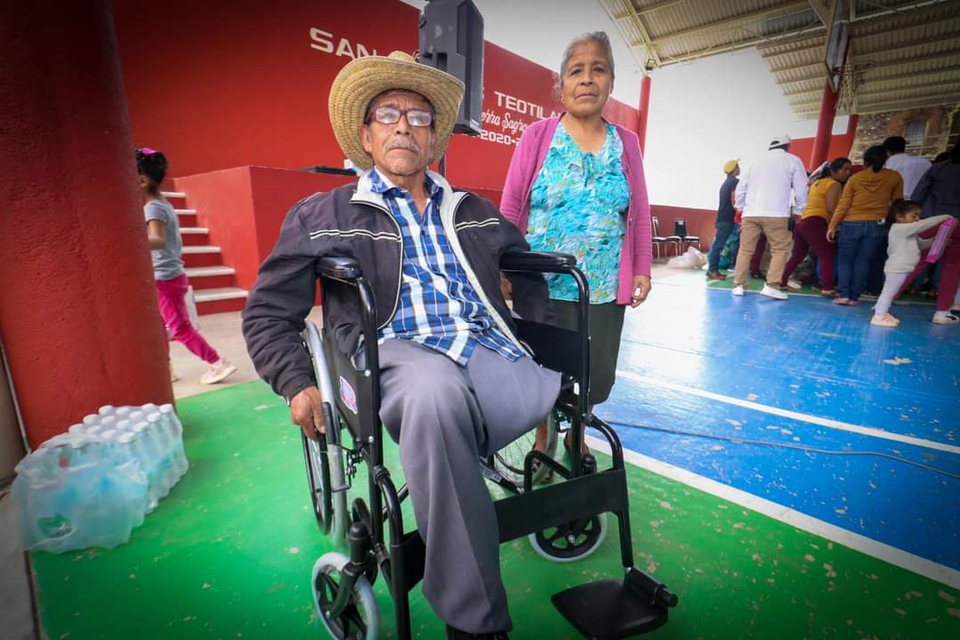 Visiblemente emocionado, don Epifanio González López, un adulto mayor de Teotilálpam, recibió una silla de ruedas, la cual dijo, le permitirá tener mayor movilidad dentro de su hogar y cuando no esté trabajando, pues por su condición, se apoya de unas muletas para dedicarse a la siembra de maíz.