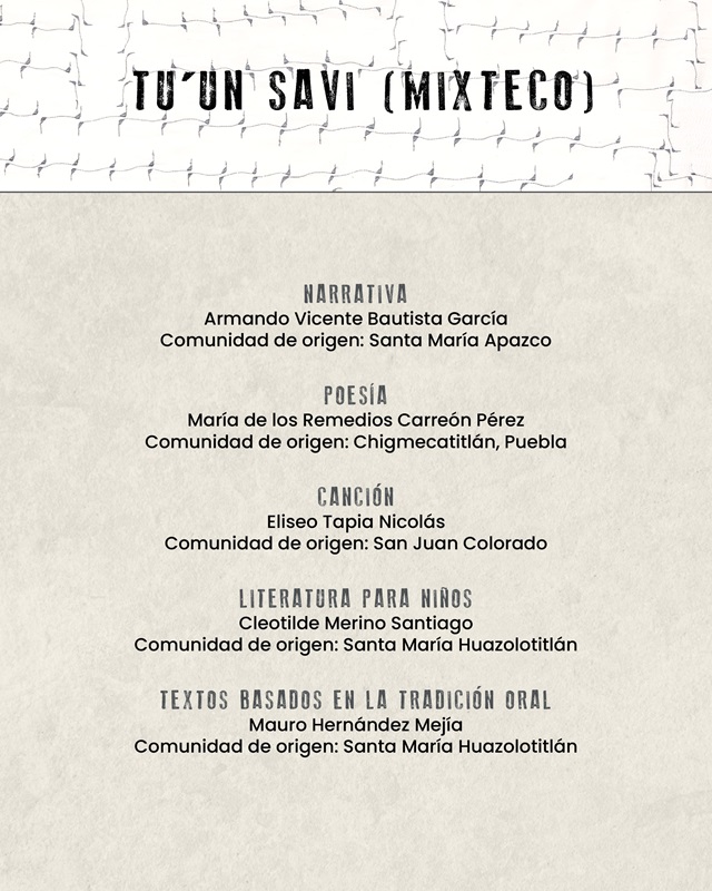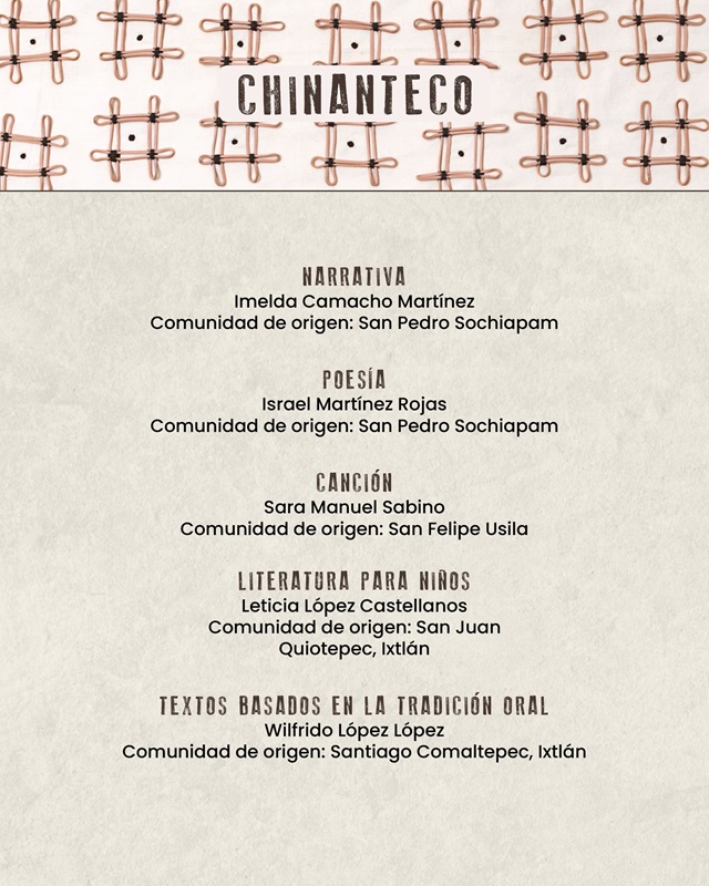 En chinanteco, Israel Martínez Rojas, Imelda Camacho Martínez, Sara Manuel Sabino, Leticia López Castellanos y Wilfrido López López. En triqui, Macario Domínguez Martínez, Teresa Gonzalez Hernandez, Isaías Hernández Cárdenas, Oralia Santiago Ramírez y Guillermo Guzmán Martínez.