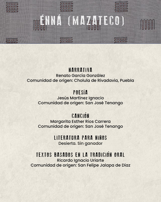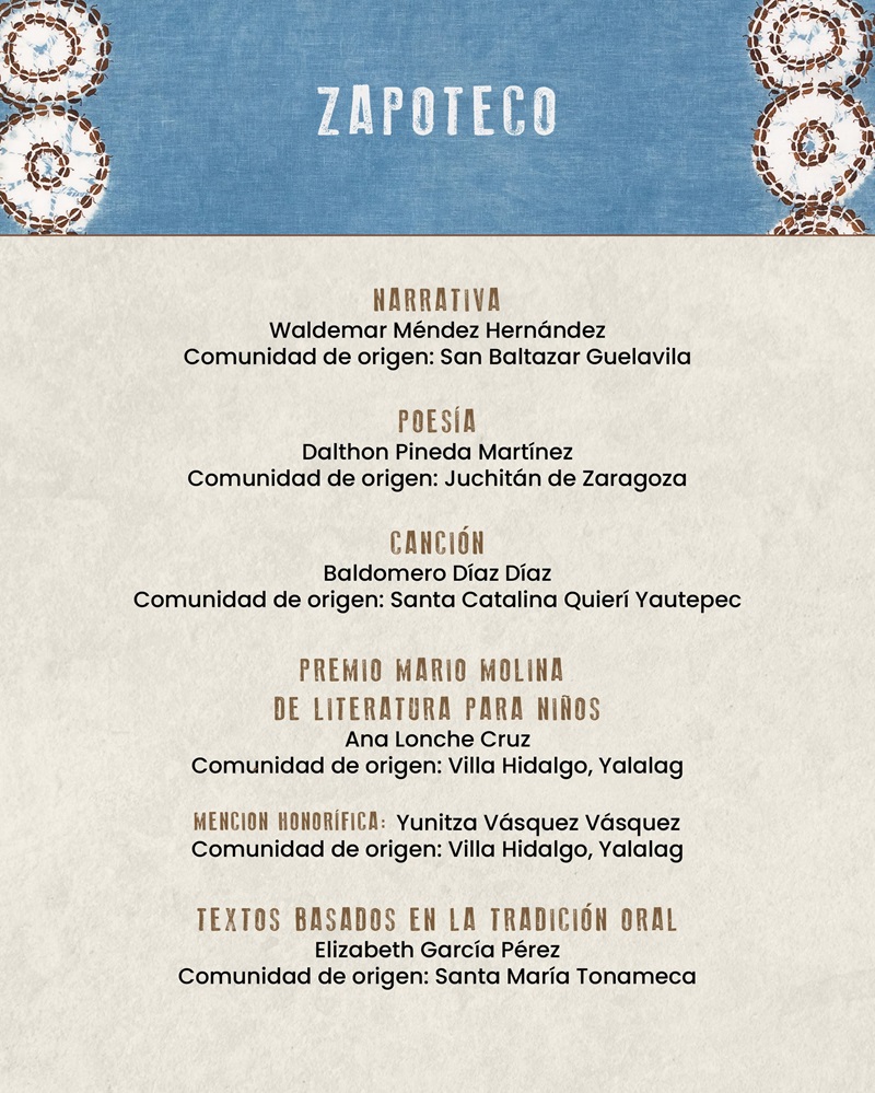 En zapoteco, las y los ganadores fueron: Dalthon Pineda Martínez, Waldemar Méndez Hernández, Baldomero Díaz Díaz, Elizabeth García Pérez y Ana Lonche Cruz.