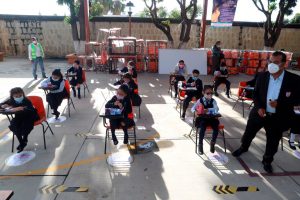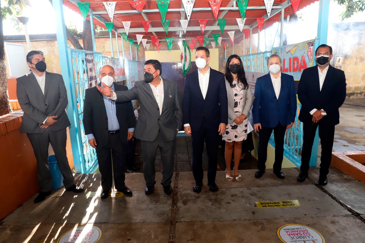 En la Escuela Primaria “Benito Juárez” de la capital oaxaqueña, en donde la comunidad escolar eligió la modalidad semipresencial y en el que se llevan a cabo estrictos controles sanitarios, el Mandatario Estatal, acompañado de la directora general de Bachillerato, María de los Ángeles Cortés Basurto, en representación de la secretaria de Educación Pública (SEP), Delfina Gómez Álvarez, reconoció el trabajo conjunto de las maestras, maestros, madres y padres de familia para lograr el inicio de clases.