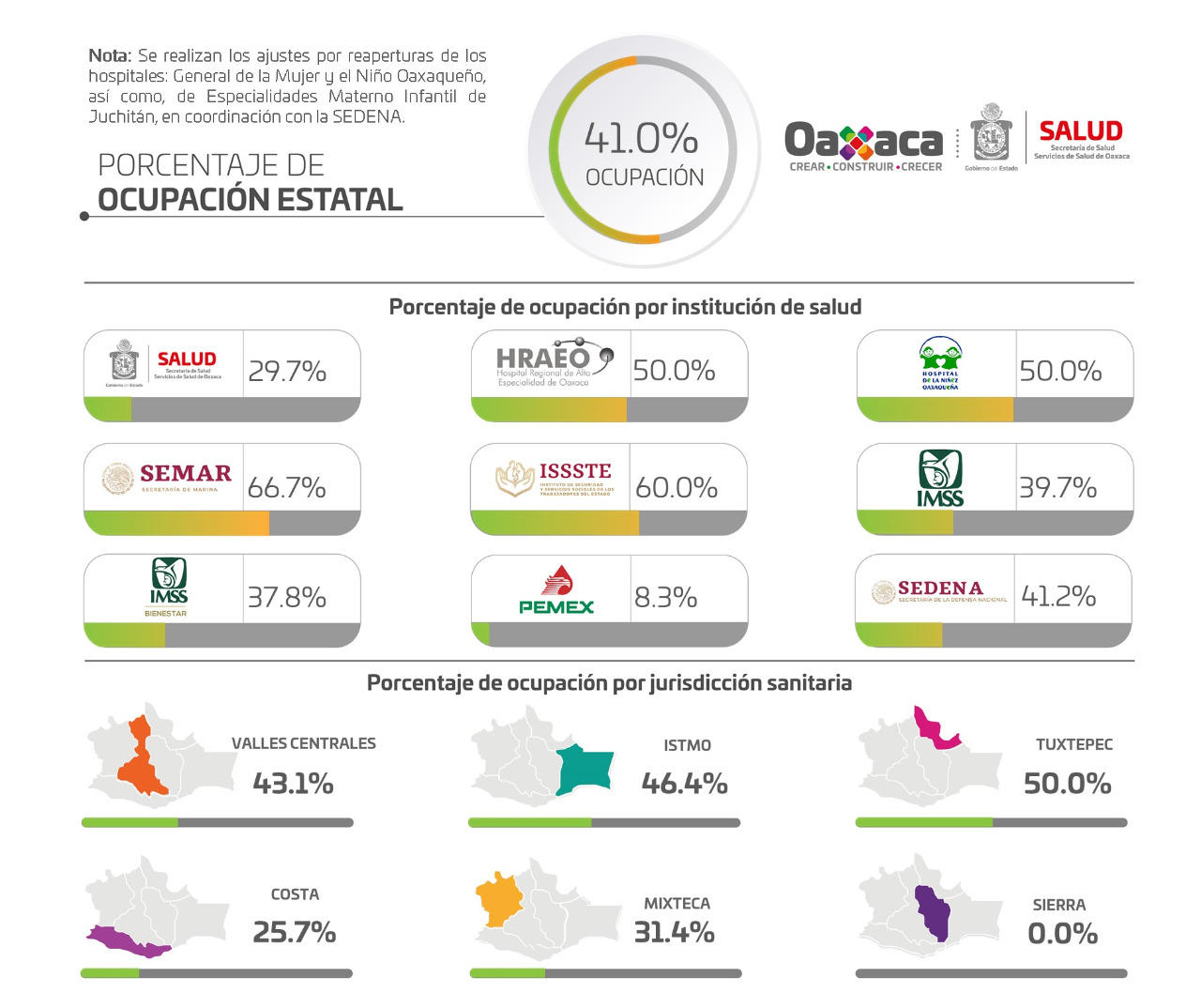 Al día de hoy se tiene 189 pacientes recibiendo atención de especialidad, de los cuales tres son nuevos ingresos. Por Jurisdicción Sanitaria, Valles Centrales concentra el 43.1% de ocupación médica, Istmo 46.4%, Tuxtepec 50%, Costa 25.7%, Mixteca 31.4% y la Sierra no presenta hospitalizados.