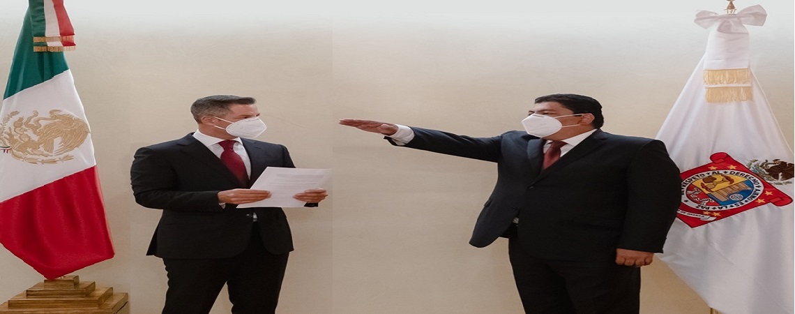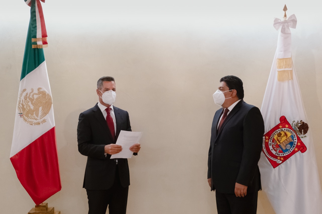 Oaxaca de Juárez, Oax. 19 de octubre de 2020. Con el firme compromiso de seguir fortaleciendo las acciones gubernamentales a favor de las y los oaxaqueños, el gobernador Alejandro Murat Hinojosa tomó protesta de Ley a Francisco Javier García López como Secretario General de Gobierno.