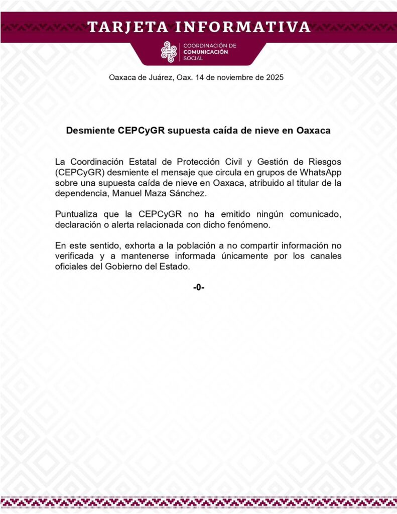 La Coordinación Estatal de Protección Civil y Gestión de Riesgos (CEPCyGR) desmiente el mensaje que circula en grupos de WhatsApp sobre una supuesta caída de nieve en Oaxaca, atribuido al titular de la dependencia, Manuel Maza Sánchez.