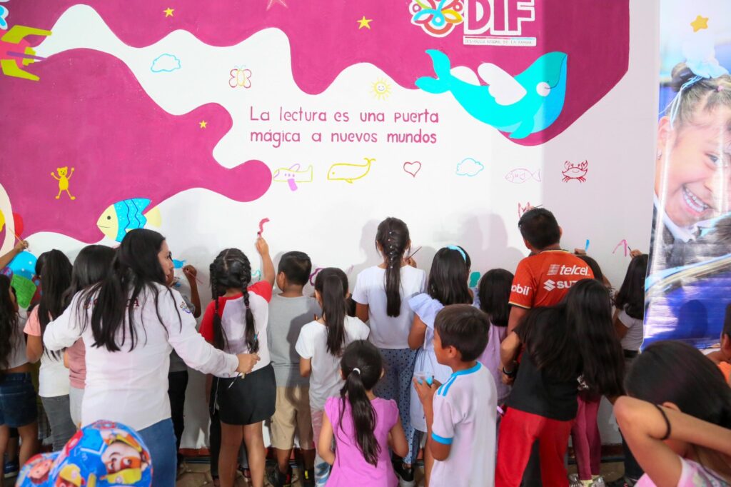 Con visibles sonrisas y buen ánimo, las niñas y niños bailaron junto a Tachi, la mascota del organismo estatal. Posteriormente intervinieron una barda con dibujos que les incentivó su imaginación y reiteró la importancia de la lectura.