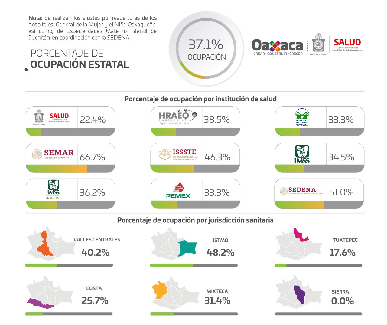 En relación a las camas ocupadas por pacientes COVID-19, por Jurisdicciones Sanitarias el Istmo registra el 48.2%, Valles Centrales 40.2%, Mixteca 31.4%, Costa 25.7% y Tuxtepec 17.6%.
