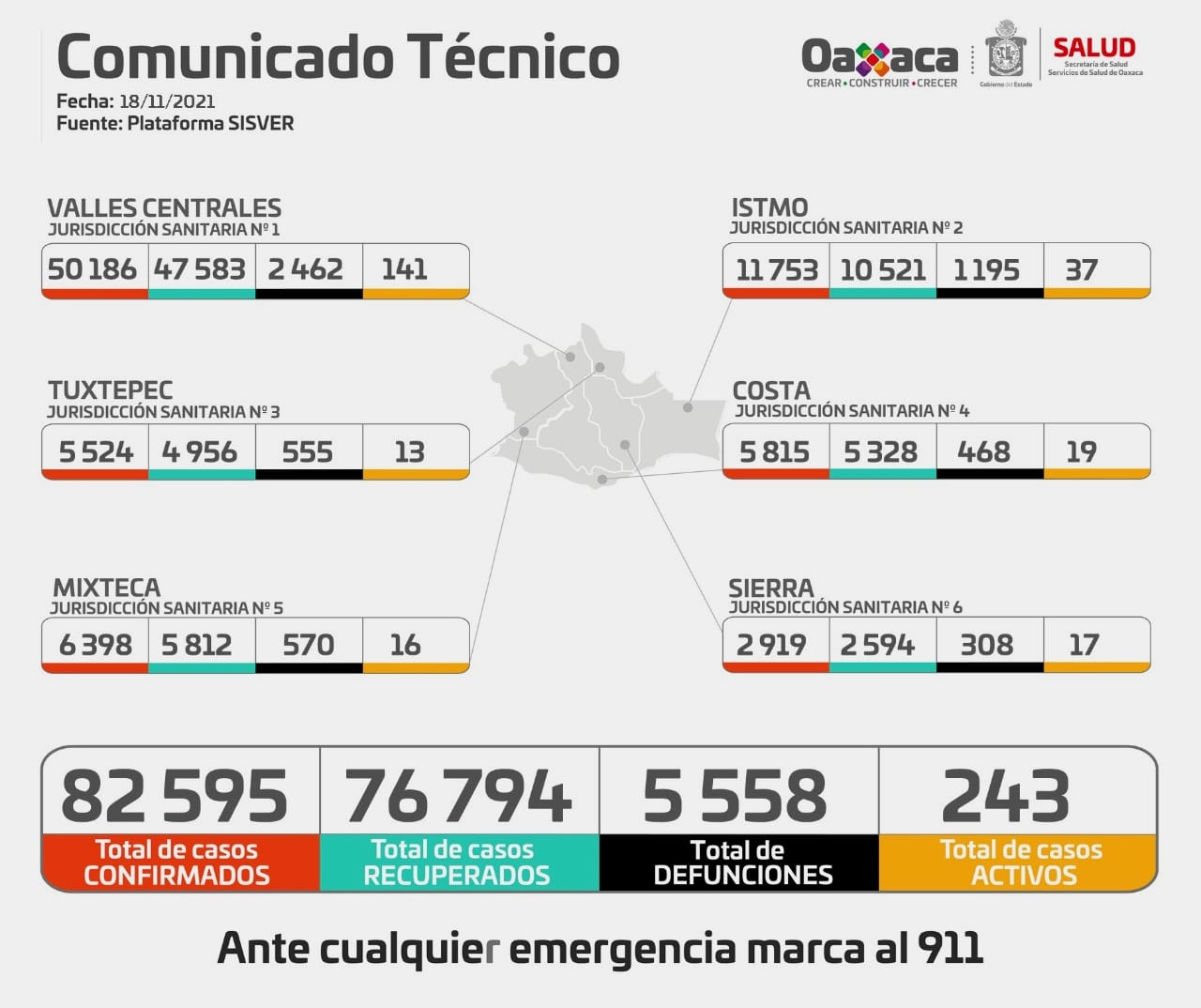 Por distribución geográficas los casos positivos y defunciones se distribuyen de la siguiente manera: Valles Centrales sumó para este jueves 50 mil 186 confirmados y dos mil 462 decesos, Istmo 11 mil 753 confirmados y mil 195 defunciones, Tuxtepec cinco mil 524 confirmados y 555 fallecimientos, Costa cinco mil 815 confirmados y 468 decesos, Mixteca seis mil 398 confirmados y 570 muertes, Sierra dos mil 919 confirmados y 308 defunciones.